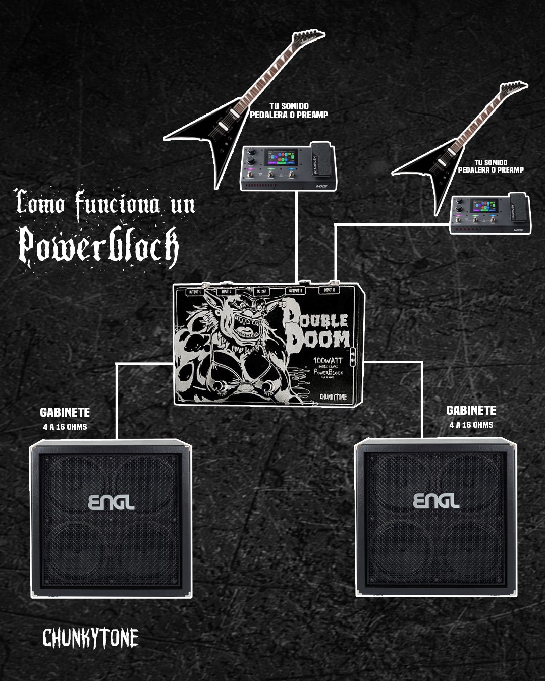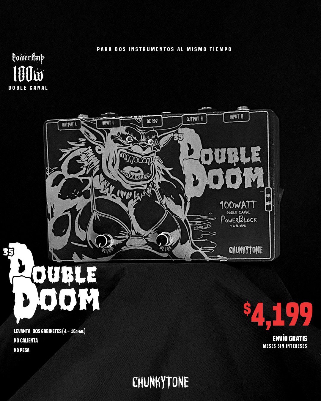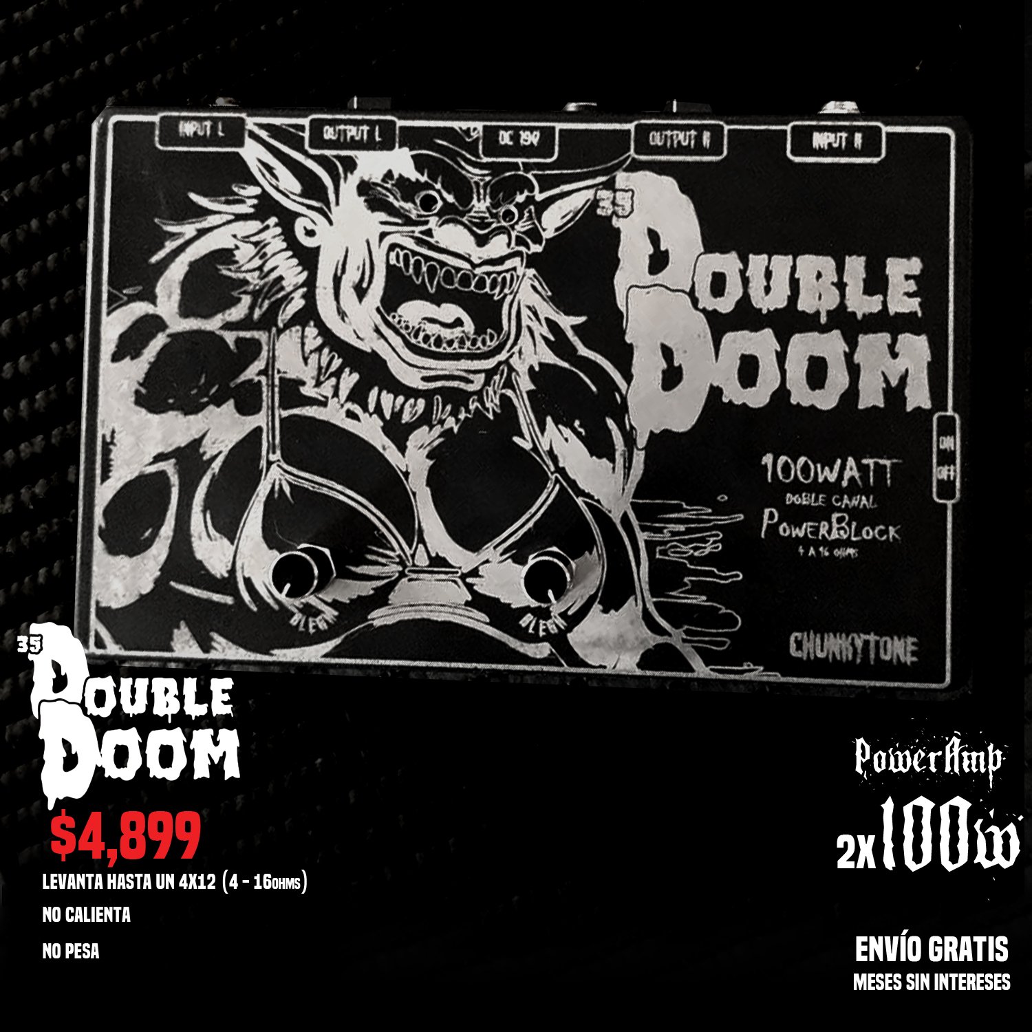 El Double Doom es un amplificador dual de 100 watts por canal, completamente independientes.